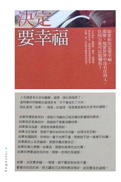 昨夜裡,回到雲林的家,翻開以前已經看過無數次的這本書-吳淡如的「決定要幸福」。讀著讀著,腦海中不斷地迴盪著兩天以來與朋友間的對話。我們各自在自己的生活中,不斷地與自己對話,希望自己能夠幸福、圓滿自己的夢想。雖然有時會往牛角尖裡鑽,還好還是有人在身邊陪伴、打氣,所以才能繼續往前為未來而奮鬥著。
